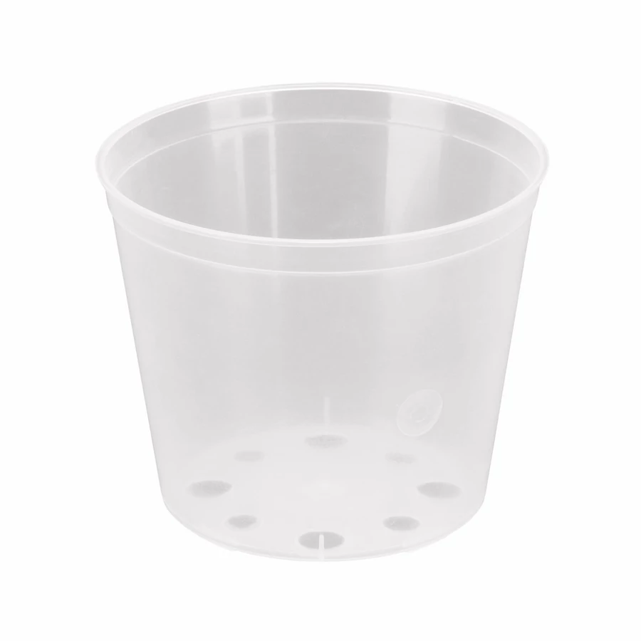 Orchidea számára készült átlátszó műanyag ültetőcserép. Belseje alul megemelt, hogy a cserép alatt hagyhassunk párologtatásra való vizet az orchidea számára. Ennek köszönhetően nem rohad be az orchidea gyökere a cserép alatt lévő víztől.